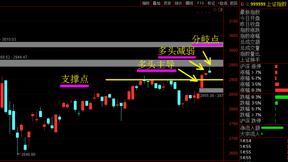 本周前三天市场走势,由多头主导走强——到多头减弱——再到多空分岐的过程。周一,证券受单次T+0利好大涨,与权重合力之下,大盘一阳强势上穿2900点。周二,保险、银行作为指数主要推动力,缺少了证券的参与,力度有所减弱,但北向资金大举买进招商银行,中国平安等低估值的蓝筹股。周三,证券不仅没动还拖后腿了,只是保险及银行早间大幅放量抢筹,往上拓展空间,与此同时代表小盘股的黄线背驰而行,出现跷跷板现象。午后指数上攻受阻带量回调,基本回补了今天跳空缺口。