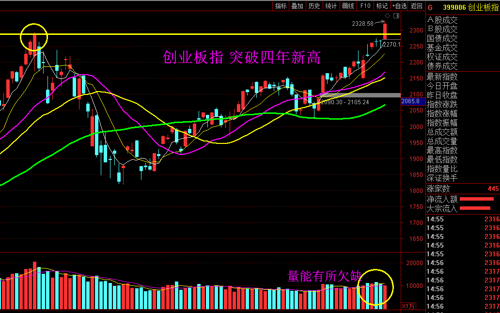 继昨天午盘三大金融异动之后,今天指数继续走高,创业板指大涨2%站上2300点,创下四年新高,但成交量有所不足;券商午后发力走高,带动上证指数打出2973高点,主板的量能倒是有些放大。