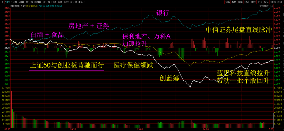 早间,大小指数今天背驰而行,一边是上证50持续拉升,主要是因为大消费(酒、食品、家电家居)、大金融(证券、保险、银行)、以及基建类(地产、建材)合力做多;一边是创业板趋势加速之后的出现盘中深度跳水,医疗保健领跌,宁德时代、爱尔眼科、智飞生物等创蓝筹纷纷杀跌。市场整体板块表现出大小的转换,尾盘蓝思科技、中信证券等龙头股直线拉升,带动市场回升。板块上,白酒、地产等权重板块全天大涨,券商、银行等活跃,医疗器械板块则领跌,个股涨跌互现,涨停60余家。