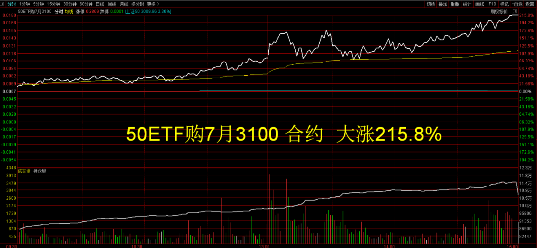 指数行情出现,且有量能验证,今天接近万亿(9073亿)的成交额,是一个很大的信号和信心,承接力度在增强,这就会形成马太效应,更加推动金融的上涨,特别是券商的带动频率就会多起来。当然阶段涨多了就会调整,创业板如此主板也一样,但中期趋势向好,只要做好低吸策略即可,不必追买。策略上,建议仓位适中即可,配置上,业绩增长+题材为主,比如:业绩高增长的低估值金融品种,中期业绩增长确定性强,短期有事件驱动科技消费股等。期权再现翻倍行情,指数7月开门大红,为下半年开了个好头,搂起袖子加油干的时刻来临了。