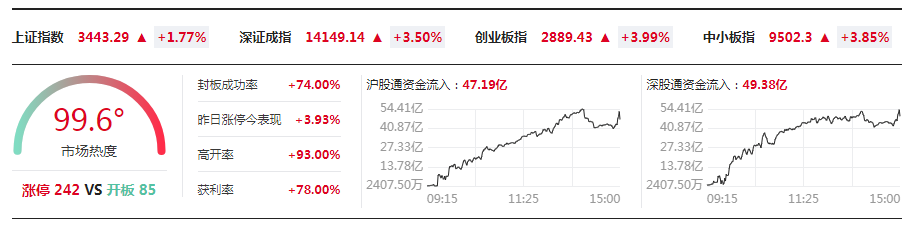 大小指数共同走高,创业板指指一度涨超4%持续逼空,收光头光脚阳线,深成指涨超3%,沪指涨超1.5%,个股普涨逾200股涨停,两市成交额连续六个交易日突破1.5万亿,市场情绪较为亢奋。