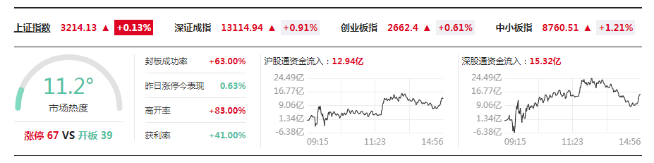 继昨天空头宣泄之后,今天指数早盘冲高回落,午后维持弱势震荡,整体收星线,叠加两市成交量萎缩明显,个股涨跌互半,说明市场资金表现谨慎与观望态度浓重。截至收盘,沪指涨0.12%,报收3214点;深成指涨0.91%,报收13114点;创业板指涨0.61%,报收2662点。市场成交量大幅萎缩,两市合计成交1.12万亿元,较昨天减少了约0.4万亿元。行业板块涨跌互现,航天军工板块领涨,券商与保险板块领跌。北向资金今日净流入33.01亿元。