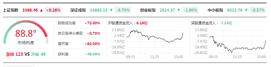 指数开盘后震荡下行,临近午盘企稳回升,午后分时呈现W底走高,截至收盘,上证指数涨0.26%,深证成指跌0.70%,创业板指跌1.60%,有色全天强势,军工、黄金概念午后走高,券商股尾盘急拉,两市个股依旧跌多涨少,涨停增至130余家,炸板率较低,成交额连续七日破万亿,市场氛围整体尚可。